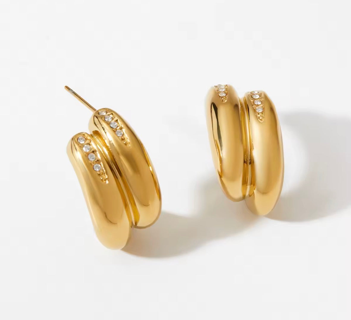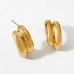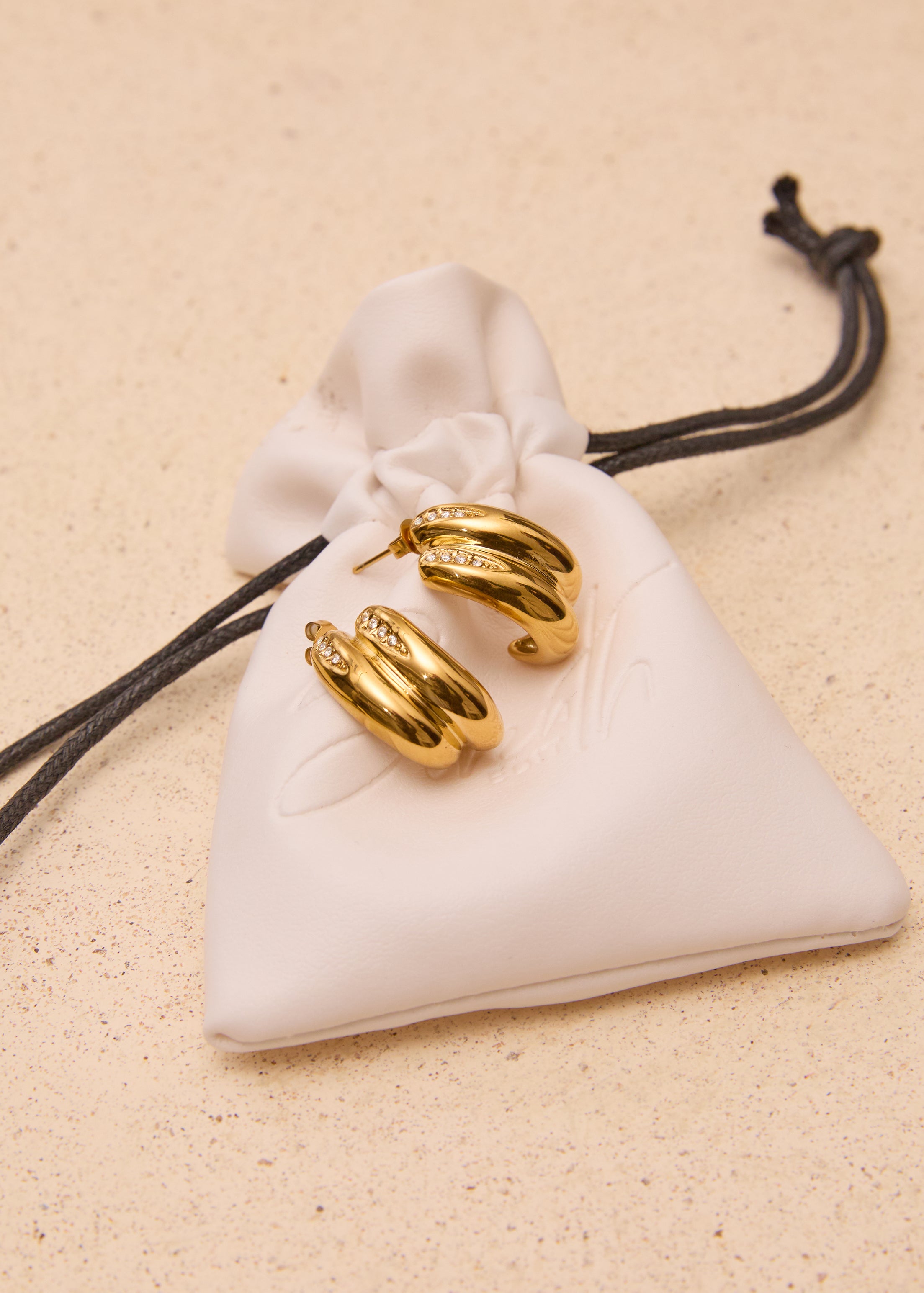 Featuring a sculptural double band silhouette with delicate crystal detailing, these hoops are designed to give the illusion of a layered ear look in one effortless piece. The polished gold finish brings warmth and shine, while the subtle stones add just the right amount of light-catching glamour.