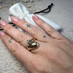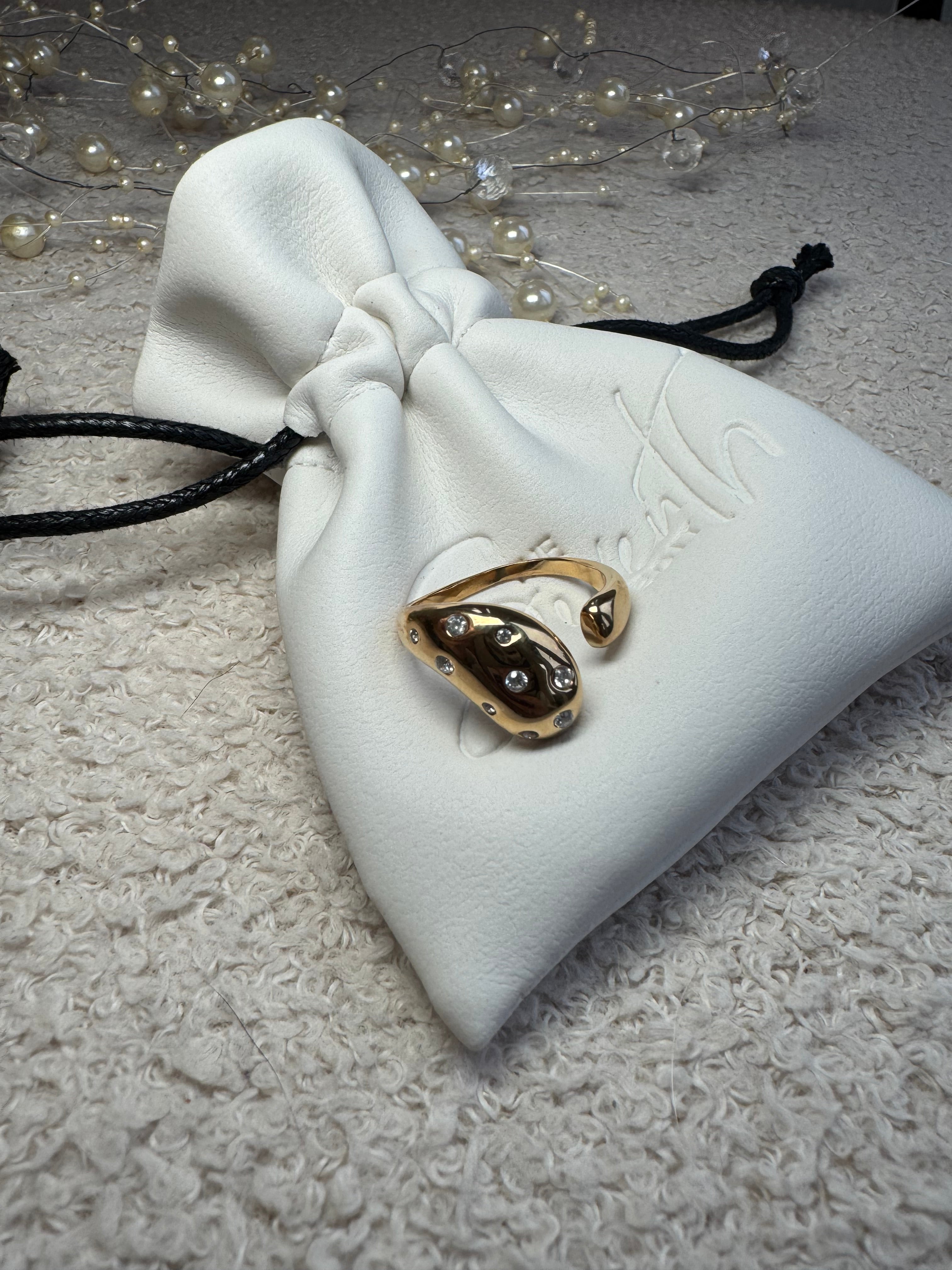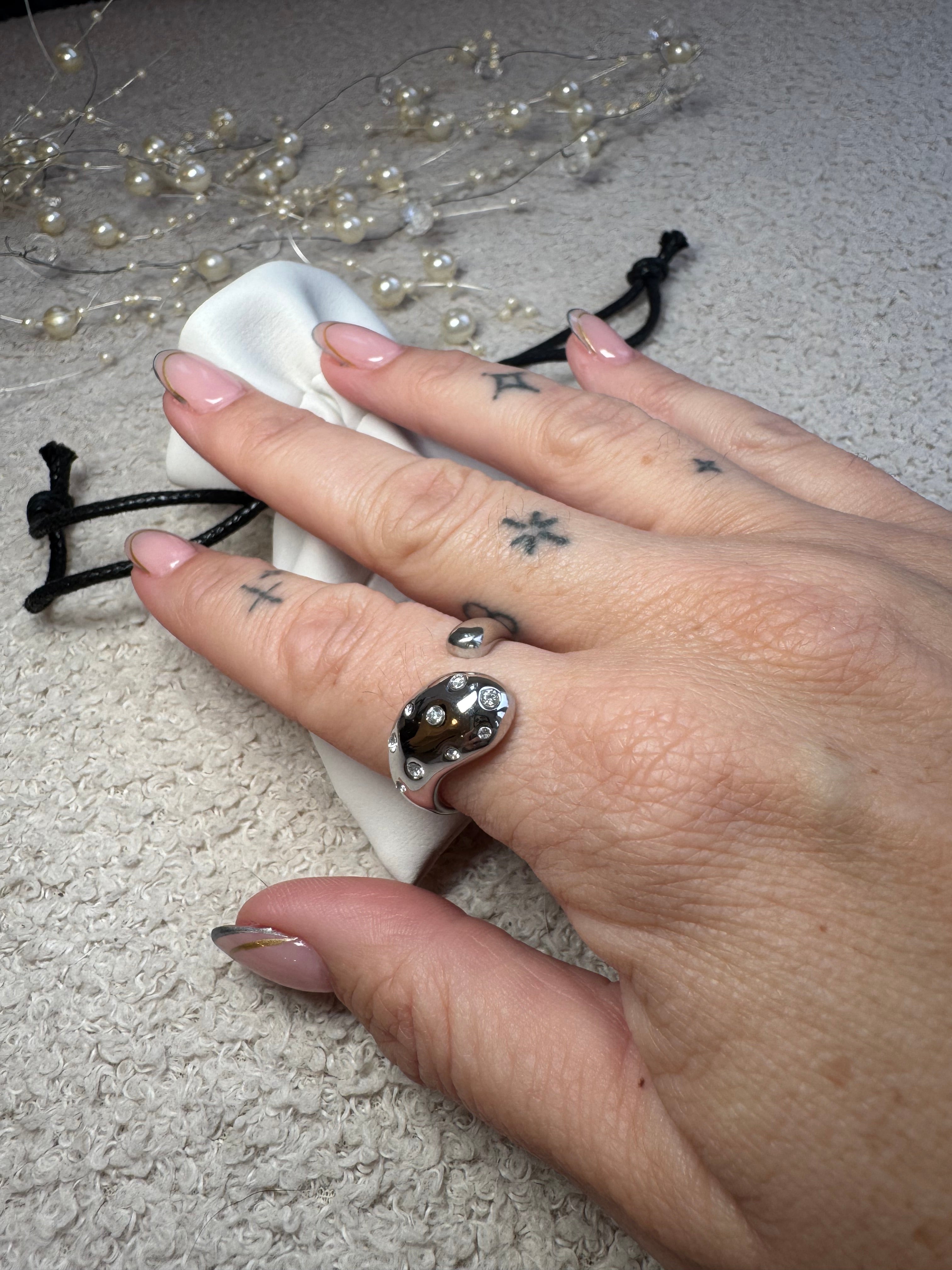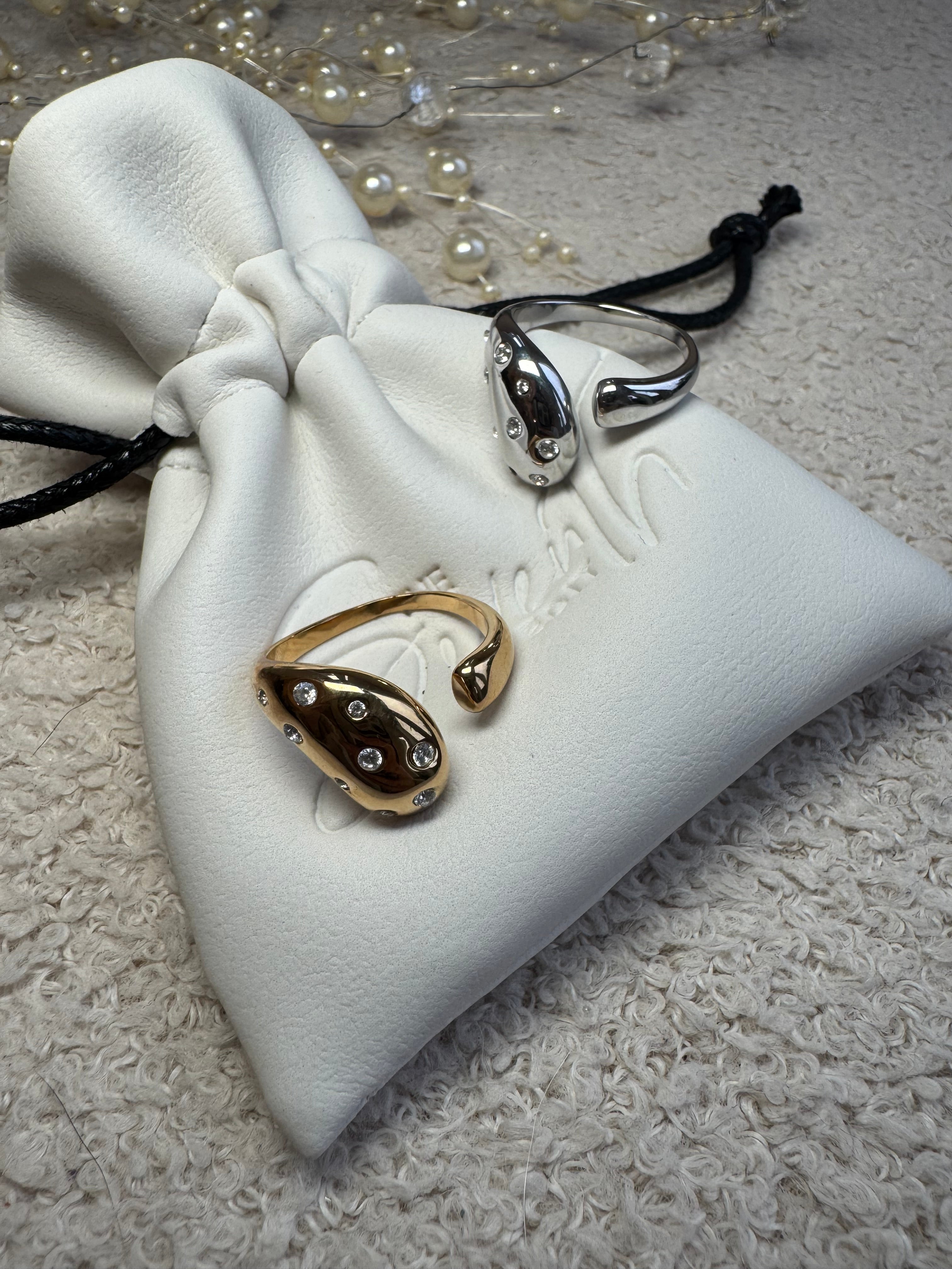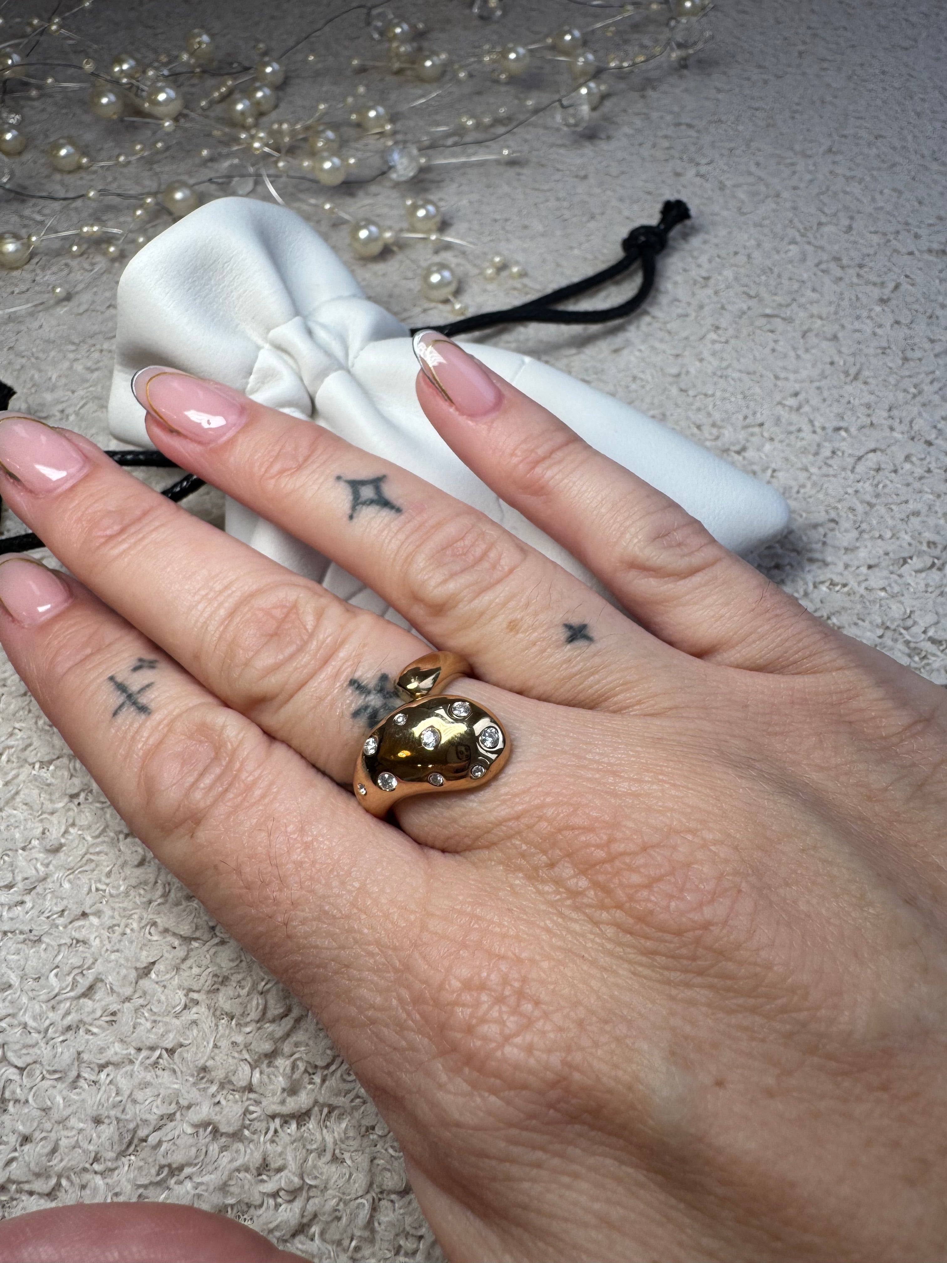 Meet your new everyday statement ring,  a modern molten design dotted with sparkling crystals for that effortless, on-trend shine. Available in gold and silver, this piece blends sculptural style with a smooth, comfortable fit. Made from durable stainless steel, it’s tarnish-resistant, skin-friendly, and perfect for stacking or wearing solo.