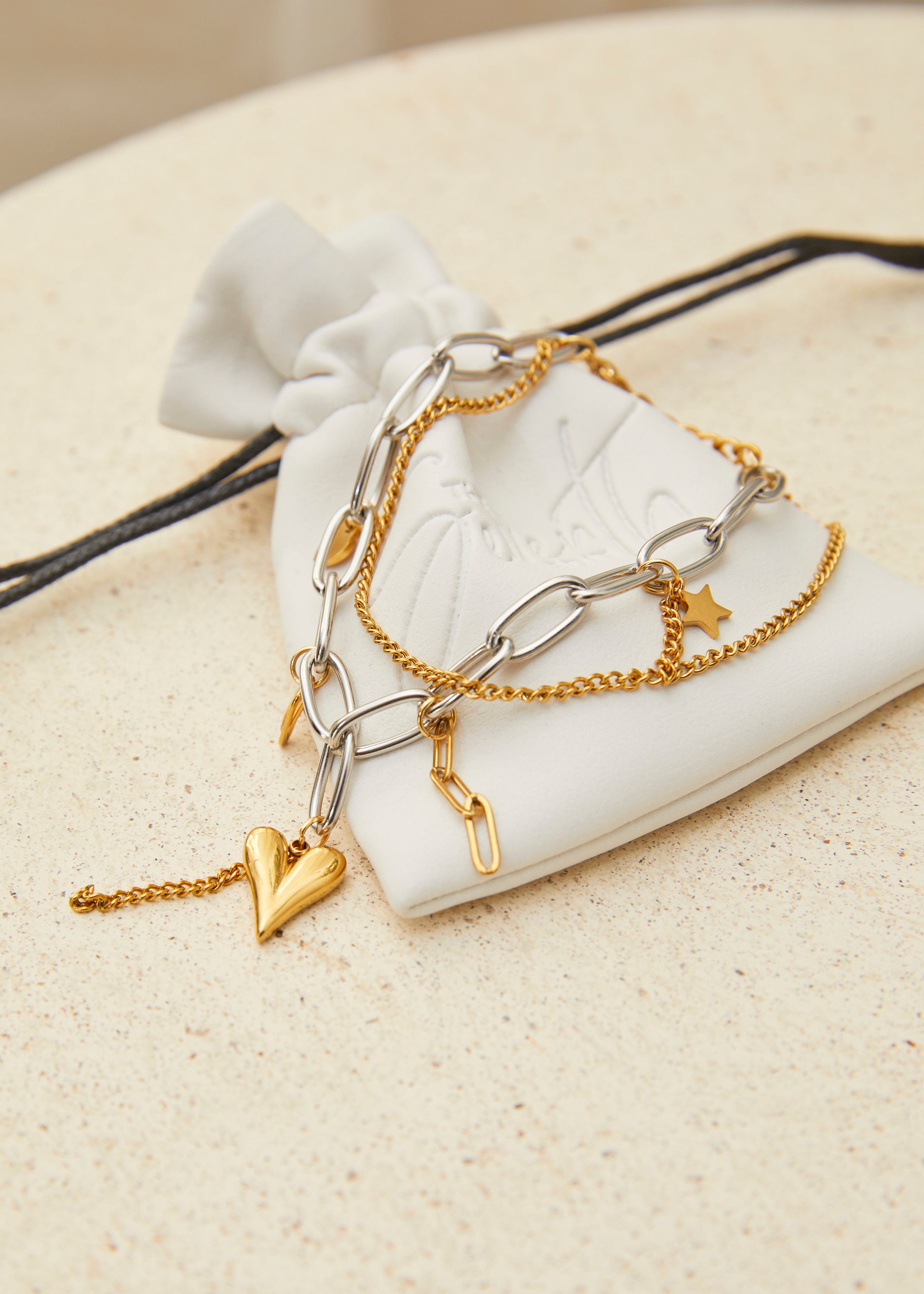 Stacking made effortless. This mixed metal chain bracelet features a blend of chunky silver links and fine gold chains, finished with delicate charms for that perfect curated wrist stack look. The contrasting metals make it versatile for everyday wear — pairing effortlessly with both your gold and silver jewellery.