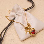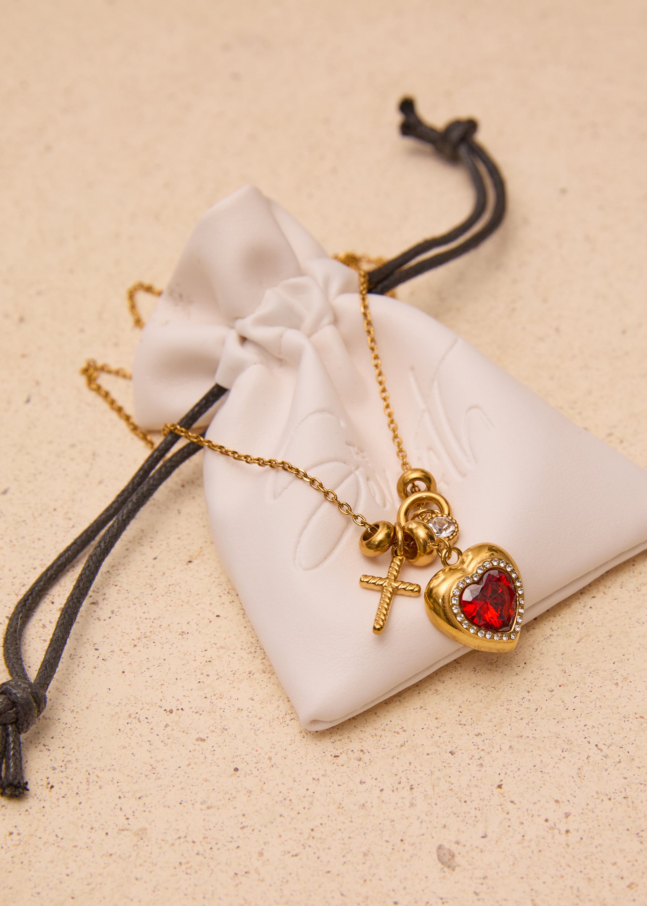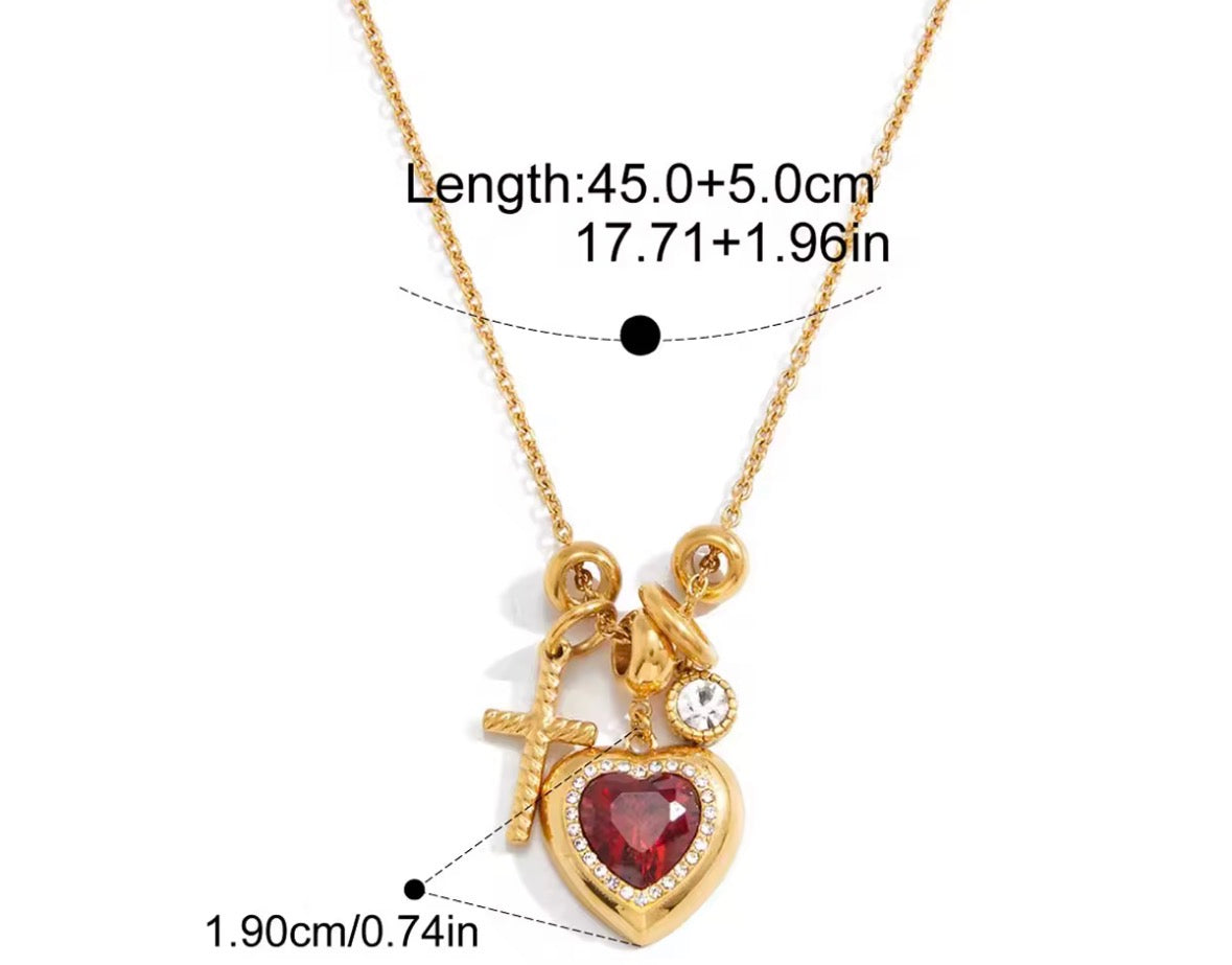 Designed with a collection of romantic charms — including a crystal heart centrepiece, cross detail and delicate watch charm — this piece blends sentiment with sparkle. The deep red heart stone sits framed in shimmering crystals, creating a luxe focal point that catches the light beautifully.